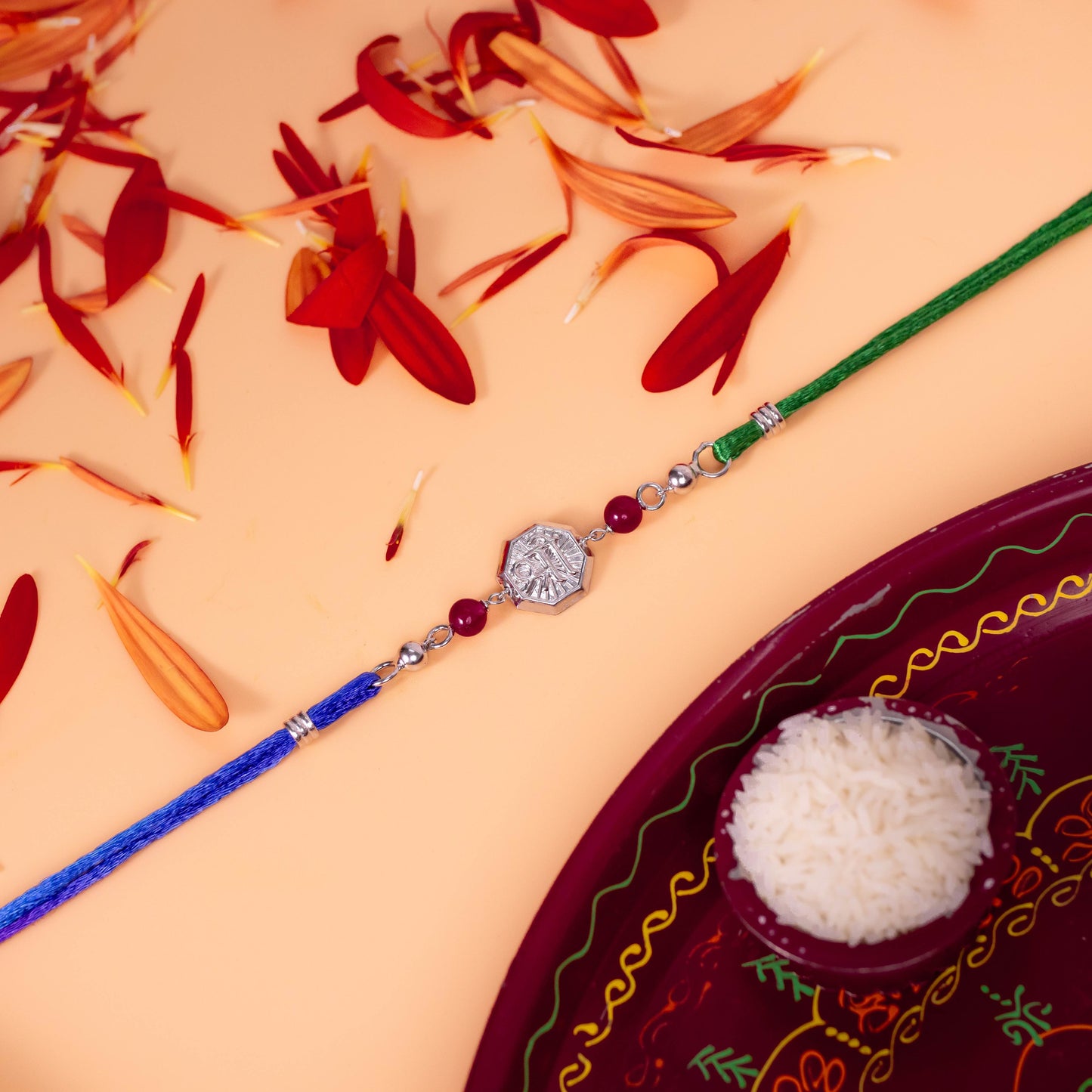 Beautiful bead Rakhi crafted in silver with cotton thread.